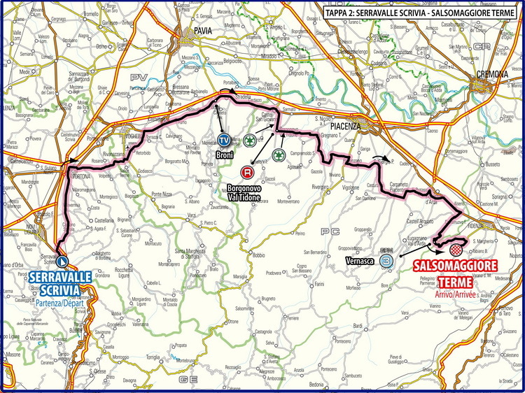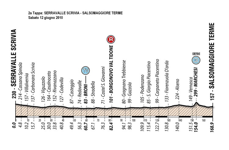 |  Km 0: | Da Serravalle Scrivia alle 11:15 prenderanno il via, per disputare la seconda frazione, i 164 atleti rimasti in gara. Ufficiale l'esclusione dal Giro Bio del Team Lucchini Unidelta per irregolaritą oggettiva del regolamento. Partita in questo momento la seconda tappa del Giro Bio |  Km 5: | Carovana a ranghi compatti |  Km 20: | Gruppo compatto |  Km 30: | Gruppo compatto che viaggia a forte andatura |  Km 40: | Si procede ancora a ranghi compatti |  Km 50: | 20" di vantaggio per Christian Delle Stelle, Marco Prodigioso e Ronan Van Zandbeek |  Km 53: | Dopo la prima ora di corsa la media e' 51,300 km/h |  Km 54: | Nel frattempo vi proponiamo il video con le interviste all'Organizzatore Giancarlo Brocci e al Responsabile Medico Dott. Luigi Simonetto, sull'esclusione del Gs Lucchini Unidelta |  Km 56: | Raggiunti i battistrada |  Km 61: | TV di Broni se lo aggiudica Piotr Gawronski |  Km 78: | Quindici corridori al comando con un vantaggio d 35" sulla testa del gruppo.